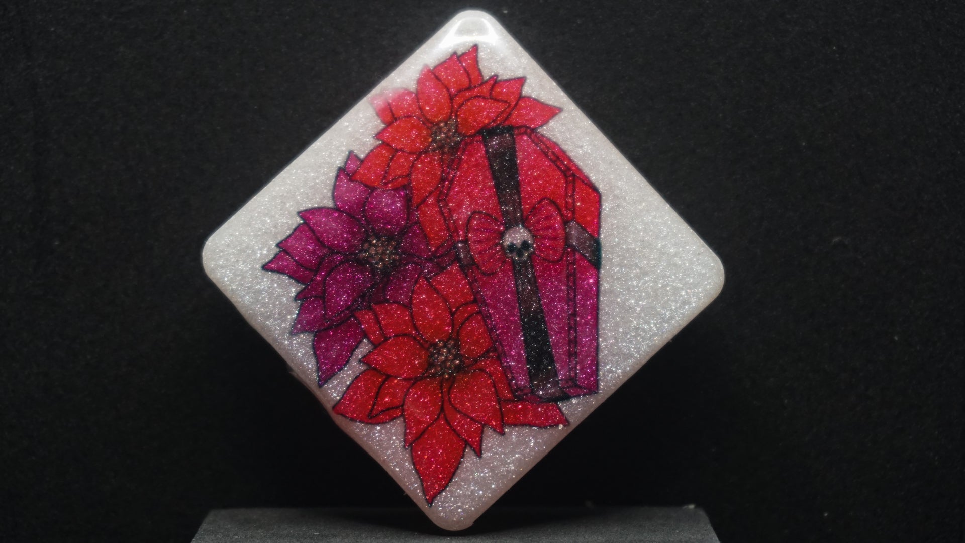All of our pieces are resin based, featuring a variety of shimmery/sparkly mica backdrops, alcohol ink, and hand painted designs. At this time we are only including personalization on the back of the tag to not compete with the design. Most alcohol ink tags are backed in either black or white depending on what we feel works the best.